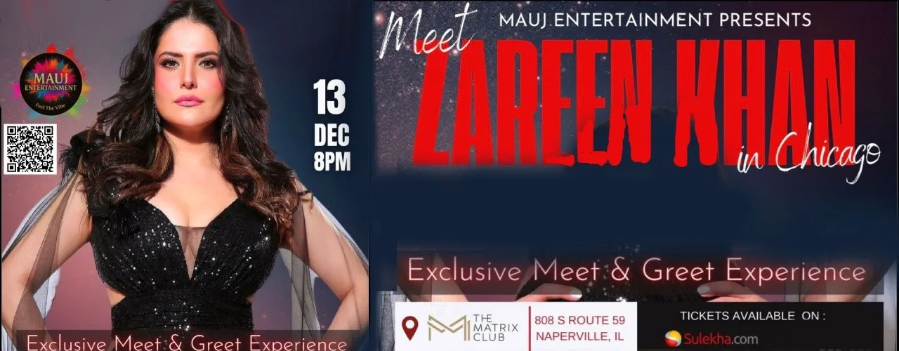 Get ready to dive into the mesmerizing world of Hindi Bollywood music, dance, singing, and an unforgettable night party as Mauj Entertainment presents the chance to meet the charismatic Zareen Khan. Save the date for this extraordinary event, happening on the 13th of December, 2025. Join us at The Matrix Club in Chicago, and be a part of an evening filled with riveting performances, enchanting music, and the irresistible allure of Bollywood.