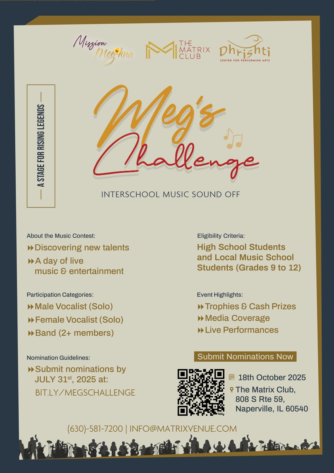 Meg’s Challenge Interschool Music Sound Off Call Us + Add to Google Calendar + iCal / Outlook export Date Jul 31 2025 Expired! Location BIT.LY/ MEGSCHALLENGE Category The Matrix Club Grand Ballroom Share this event