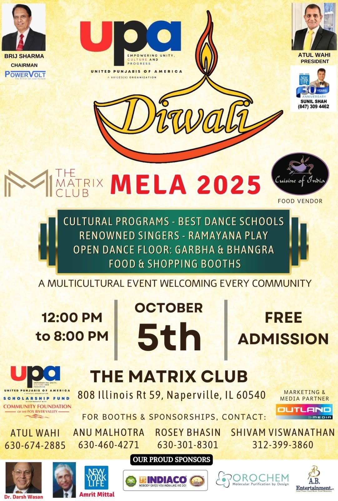 UPA Diwali Mela 2025 – United Punjabis of America A joyous, multicultural Diwali celebration featuring free entry, live Indian music + Add to Google Calendar + iCal / Outlook export Date Oct 05 2025 Expired! Time 12:00 pm - 8:00 pm Location 808 S. ROUTE 59 NAPERVILLE Category The Matrix Club Grand Ballroom Share this event